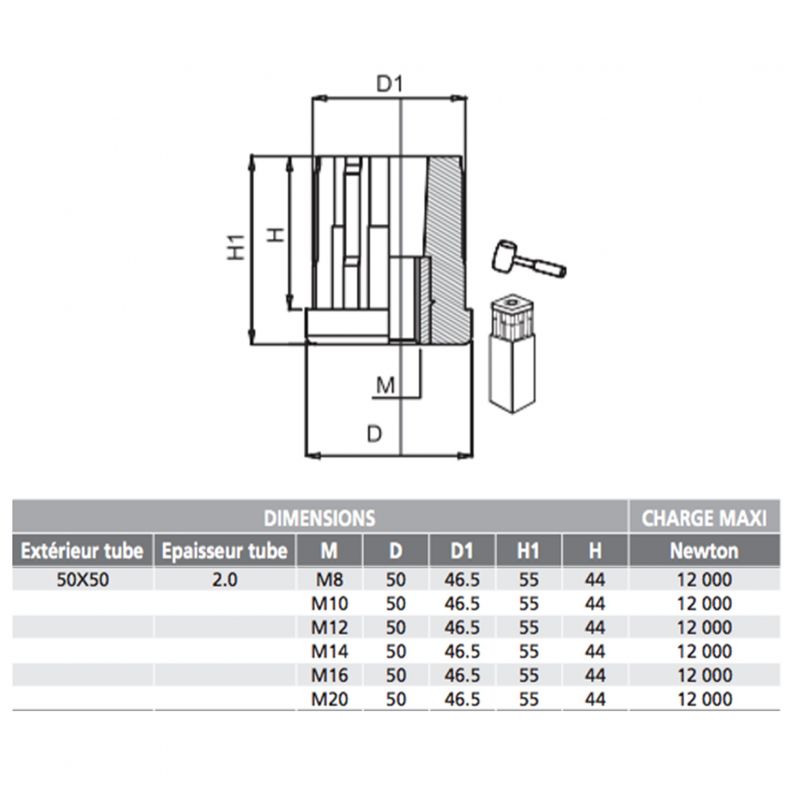 Embout tube carré 50x2 à insert taraudé en laiton M10, résistance 12 000 N