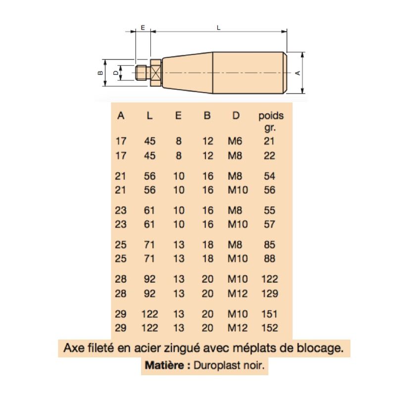 Caractéristique matière : Duroplast noir. Axe fileté en acier zingué