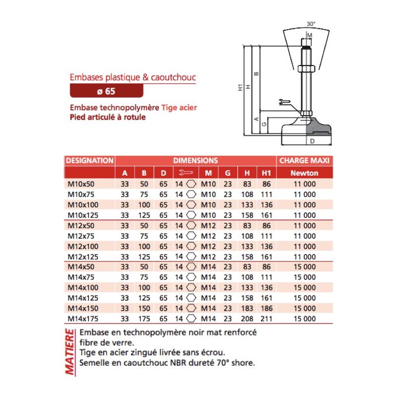 Caractéristique matière : Embase en technopolymère noir mat renforcé fibre de verre. Tige en acier zingué livrée sans écrou. Semelle en caoutchouc NBR dureté 70° shore.