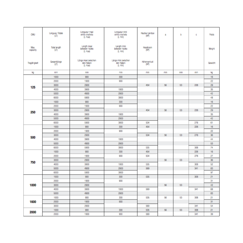 Palonnier monopoutre aluminium CMU:0,125kg à 2t fixe ou re?glable. Re?glage des crochets par axes amovibles (palonniers re?glables uniquement). Equipe? de 2 crochets tournants articule?s avec linguets de se?curite? forge?s. illets antide?chirement pour utilisation avec e?lingues synthe?tiques, ca?bles... Cf cient de se?curite? = 3. Aucune soudure portante. Fabrication selon norme NF EN 13155-2. Groupe = FEM5. Re?glage au pas = 100 mm (palonniers re?glables uniquement). Vitesse de levage = 16 m/min maxi. Livre? avec notice dutilisation et dentretien et certi cat de conformite? CE. Pour capacite?s supe?rieures, nous consulter. AUTRES CAPACITES DISPONIBLES!!!!