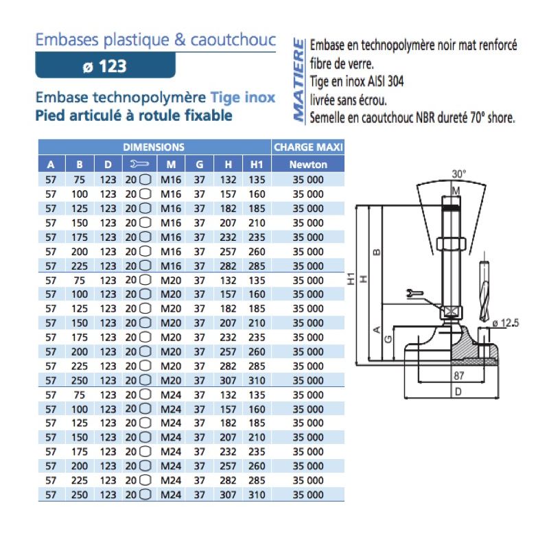 Pied articulé à rotule fixable. Embase technopolymère diam 123 avec semelle. Tige inox M16 longueur 225, charge max : 35 000 Newton