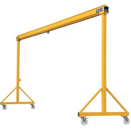 Portique acier PORTC non déplaçable en charge avec poutre en profilé creux - Capacité 0,5 t à 2 t Le portique est destiné à une utilisation intérieure. Il bénéficie d'une construction mécano-soudée démontable en 3 éléments. Le déplacement de la charge s'effectue par poussée uniquement. Doté d'un fer de roulement en profil creux, il peut être équipé d'un palan à levage manuel ou électrique (direction non motorisée). CMU 0,5 t à 2 t. Portée de 2 m à 5 m. Hauteur sous fer (HSF) de 2 m à 3,5 m. Livré avec chariot porte palan et ligne dalimentation avec patins porte câble.. Monté sur quatre roues pivotantes en polyamide blanc. Protection : système 3 couches. Finition polyuréthane RAL 1028. Vitesse de levage maximum =16 m/min. AUTRES CAPACITES DISPONIBLES!!!!