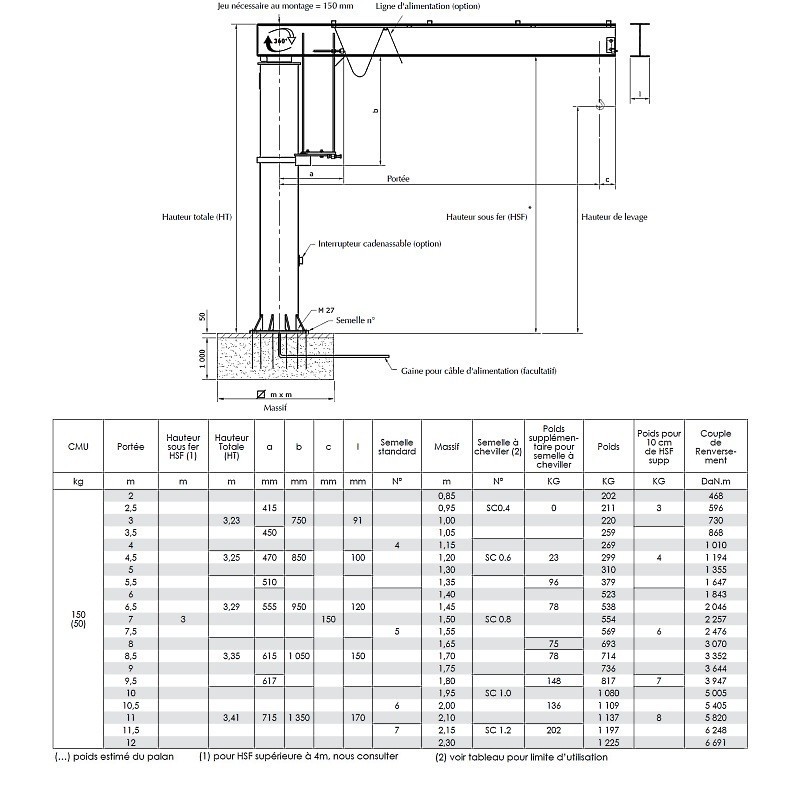 Potence sur colonne à rotation totale 360° PRT avec flèche inversée en IPE - Capacité 0,15 t à 10 t Adaptée au service intérieur et extérieur, la potence sur colonne PRT permet une rotation totale sur 360° et peut être assistée par une motorisation (en option). Sa flèche inversée en fer IPE est conçue pour un usage intensif et permet de dégager la hauteur de suspension maximale lorsque la hauteur sous plafond est limitée. La structure de cette potence est adaptée à l'installation optionnelle d'un palan à direction motorisée. La fixation au sol s'opère par chevillage chimique ou par tiges d'ancrages avec massif béton. Une gamme complète d'accessoires est disponible. CMU 0,15 t à 10 t. Portée de 2 m à 8 m (suivant capacité). Hauteur sous fer standard (HSF) 3 m adaptable en + ou en en modifiant la cote HT (pour HSF supérieure à 4 m nous consulter). Flèche théorique sous charge nominale = environ 1/250e de la portée + hauteur sans dépasser 1/100e de la portée seule. Le couple de renversement est donné à titre indicatif et sous charge nominale. Protection : système 3 couches. Finition polyuréthane jaune RAL 1028. Vitesse de levage maximum = 16m/min. Possibilités de motorisation en rotation : MOTORISATION PAR LE BAS : pour potences service intérieur, portée maxi 6 m, pour CMU maxi 2500 Kg environ. Entraînement par friction par lun des deux galets dans le boîtard situé en partie inférieure du bras de réaction. Vitesse circonférentielle en bout de bras = 15 m/min maxi. MOTORISATION PAR LE HAUT : pour potences service extérieur, Pour charges lourdes et de grandes portées. Entraînement positif situé en bas de fût par pignon et couronne. Ce système peut être monté sur tous les types de rotations totales pour obtenir des vitesses plus élevées. AUTRES CAPACITES DISPONIBLES!!!!