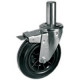 Roulette pivotante à frein, monture en tôle d'acier emboutie zinguée double rangée de billes, roue à bandage caoutchouc noir, corps plastique moyeu lisse. Tige centrale en acier estampé montée par rivetage. Economique, silencieuse, pour sols irréguliers, 80°ShoreA , -10°C à +60°C