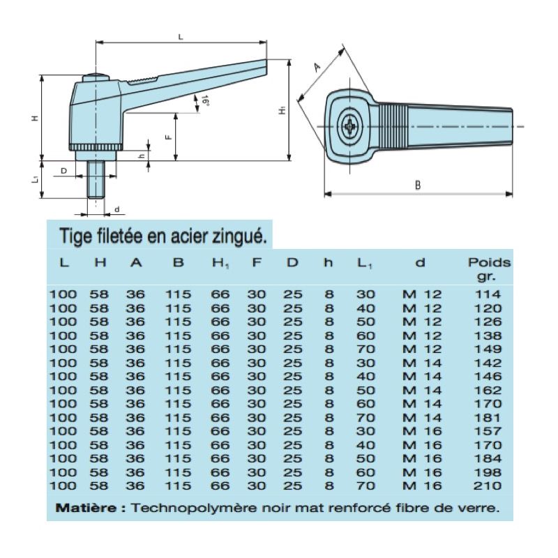 Caractéristique matière : Technopolymère noir mat renforcé fibre de verre. Tige filetée en acier zingué.